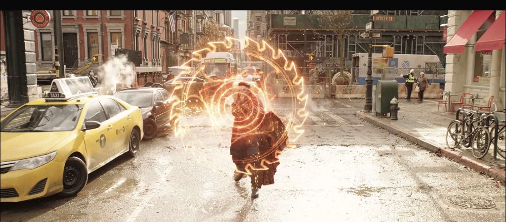 The movie stars with us, the audience? Being thrown into a fight sequence with a certain monster, whom can be found in the Marvel comics! It features Doctor Strange, Wong and America Chavez, which is our main character in this movie. She shows up from an alternative reality asks for Doctor Strange’s help because she opened up petals whenever she is frightened by something, one time she was frightened so she opened a portal and accidentally put her moms, yes I said moms, I really that LGBTQIA+-representation from the filmmakers, by the way, into an alternative reality. Now she asks Stranger for help to find her parents by traveling with him within the multiverse. I really liked that long, very overwhelming, yet beautifully edited traveling sequence. At one point we saw a reality, where both characters were made out of paint which was very beautiful, if you ask me.